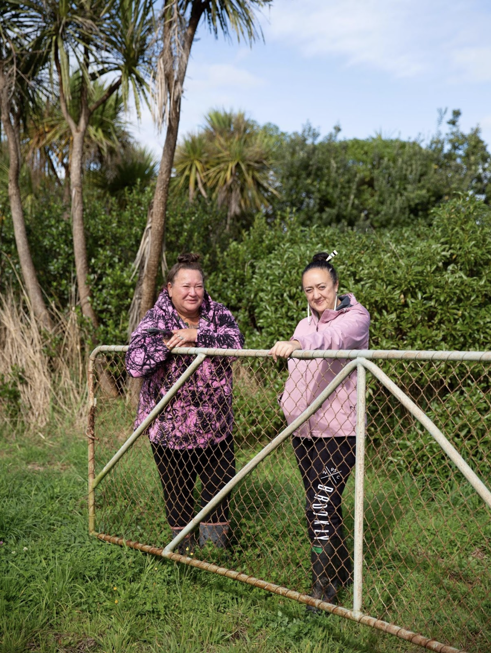 Moira Poutama and Dr Aroha Spinks at the gate to Te Hākari a Ngāti Tukorehe restoration project (Taken by Sylvia Wintel).